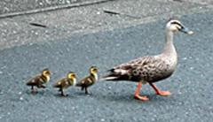 ある日の雨上がり、窓の外に目をやると水鳥の親子を発見! 「いったいどこから来たんだろう?」 店の前の道路や駐車場を縦断したり、横断したり・・・、お客様の車の下を通ってみたり・・・。まるで