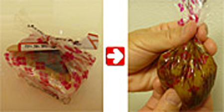 「容器を包んでいるビニールの包みを広げて、そこに容器の中のきな粉と餅をすべて出し、さらに黒蜜を加えてからビニールの包みを閉じて浅漬けをもむように混ぜ合わせた後、包みを広げてようじでいただく」が正解でした!