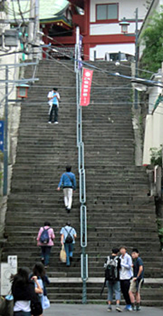 角を曲がって見上げると、目に飛び込んできたのは明神男坂と呼ばれる68段の石段。「えぇー、聞いてないよぉ(泣)・・・。」