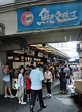 築地市場は観光客を対象に400軒の飲食店・商店が軒を連ねる「築地場外市場」と、魚介類・生鮮食料品のプロの仕事人が働く「築地場内市場」に分かれます。「場内市場」の一角には一般人も利用できる魚がし横丁があり、江戸前寿司の名店が並びます。今年11月に豊洲に移転を予定していたのがこの「場内市場」で、(今回小池都知事が一旦移転延期としましたが)移転前に魚がし横丁で江戸前寿司をと、築地市場を目指しました。