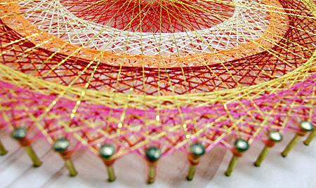 必ず戻ってきて幾何学模様が出来るそうです。糸をかける順番を間違わなければ、きれいな模様がスムーズに出 来上がるとのこと。雑念があったり、選んだ糸の色が合っていないと最後まで辿り着かないんですって。本当に本当に不思議です・・・。